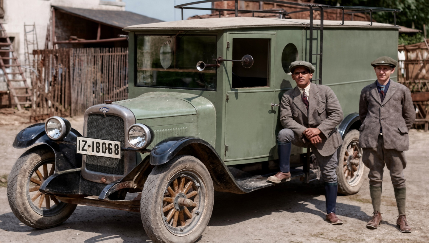 Lieferwagen 1926 mit Pedi Streit und Peter Willems