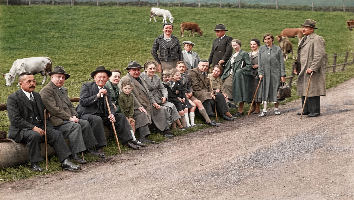 1937 - Wanderung Birresborn Sitzend v.l.: Adam Plein, ?, Johann Willems, Frau und Herr Fischer, Frau und Herr Becker Stehend v.l.: Johanna Hoffmann, Matthias Lauterborn, Dr. Jakob Plein, Maria Endres, Maria Lauterborn, Frieda Hütten, Johann Endres