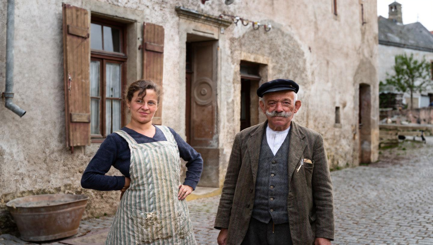 1935 - Johann Franzen mit Tochter Anna vor ihrem Haus in der Preisterstraße (heute Grünanlage und Straße)