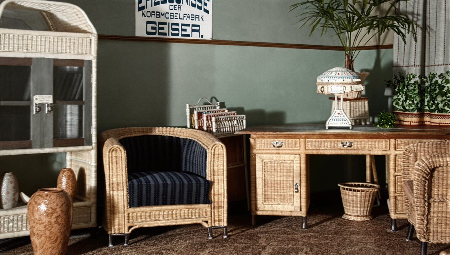 Stand mit den Erzeugnissen der Korbmöbelfabrik Geiser