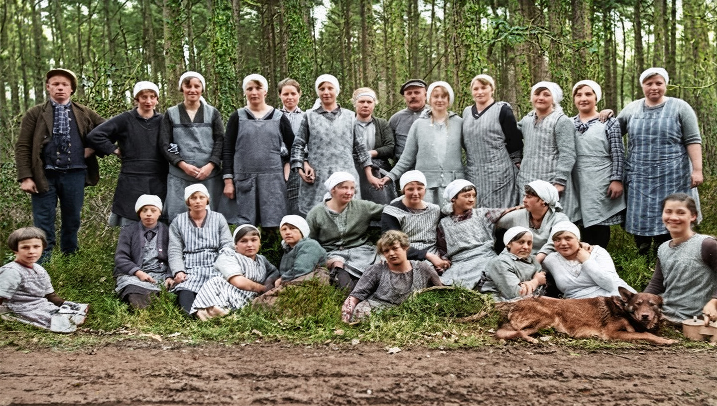 Pflanzkolonne um 1930, die Frauen hatten einen Stundenlohn von 0,40 Reichspfennig. Der Arbeitsplatz war nur zu Fuß oder per Fahrrad zu erreichen.