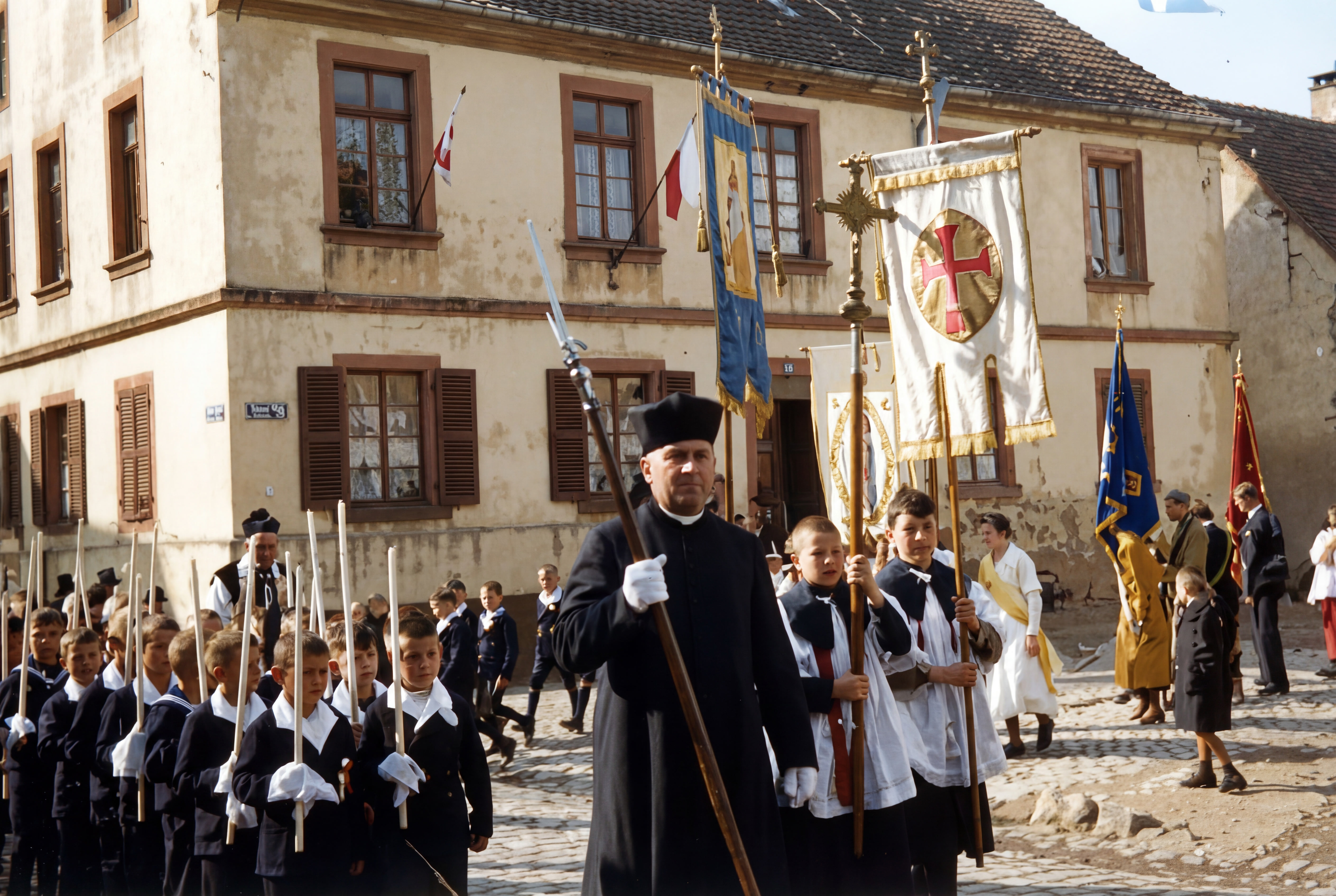 Kommunionkinder vor der alten Schule Ecke Hühnergarten Neugasse mit Pastor Lauer und dem Kirchenschweizer Denis im Jahre 1934