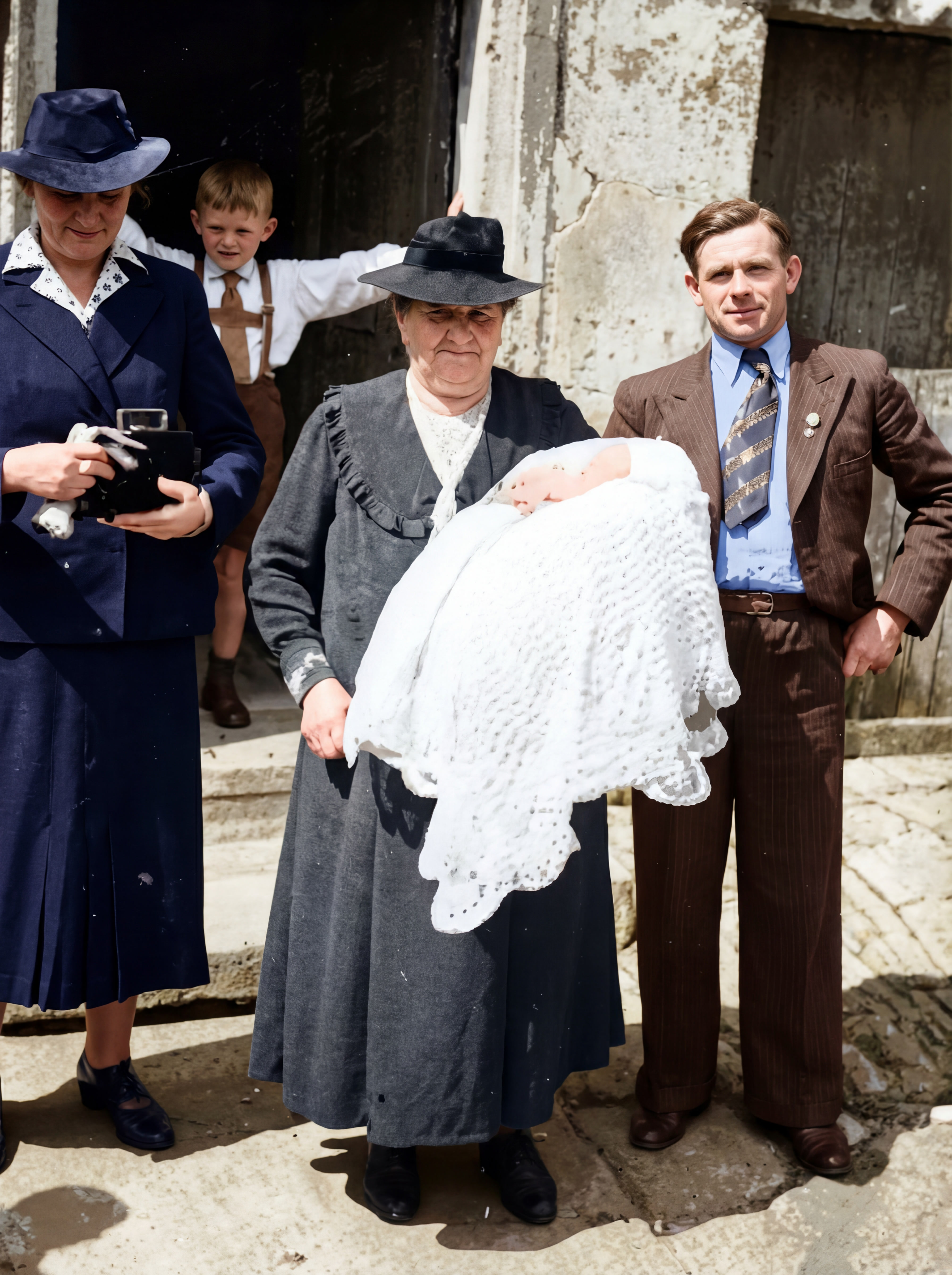 Kindstaufe im Hause Wingenter 1946, v. l.: Patin Appolonia Schmitt (geb. Wingenter), Frau Graf, die langjährige Hebamme von Speicher und Pate Matthias Fuchs