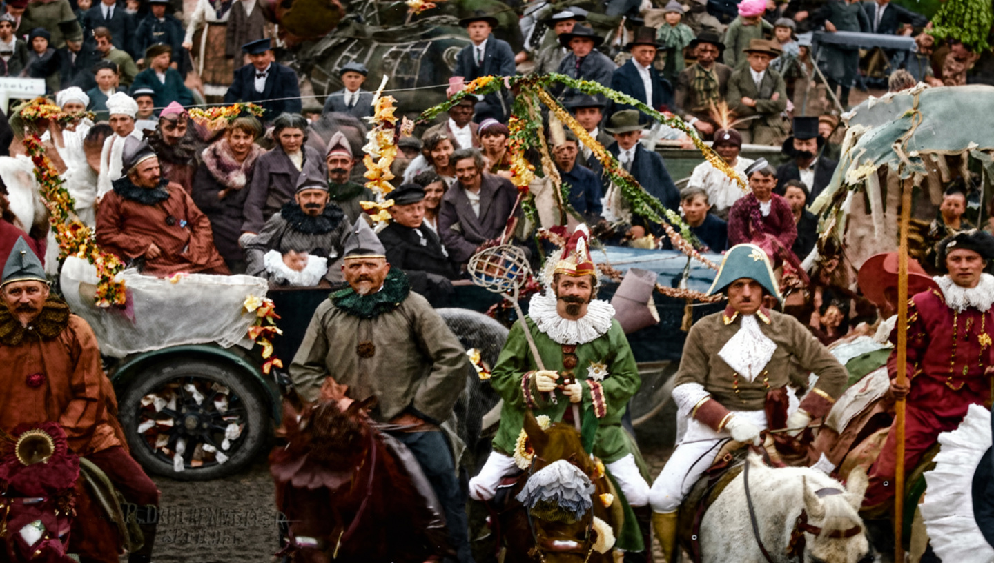 Großer Umzug im Jahre 1929 - im Vordergrund zu Pferde v.l.: Johann Reichertz, Willi Conrad, Ludwig Becker, Leo Müller, Peter Willems