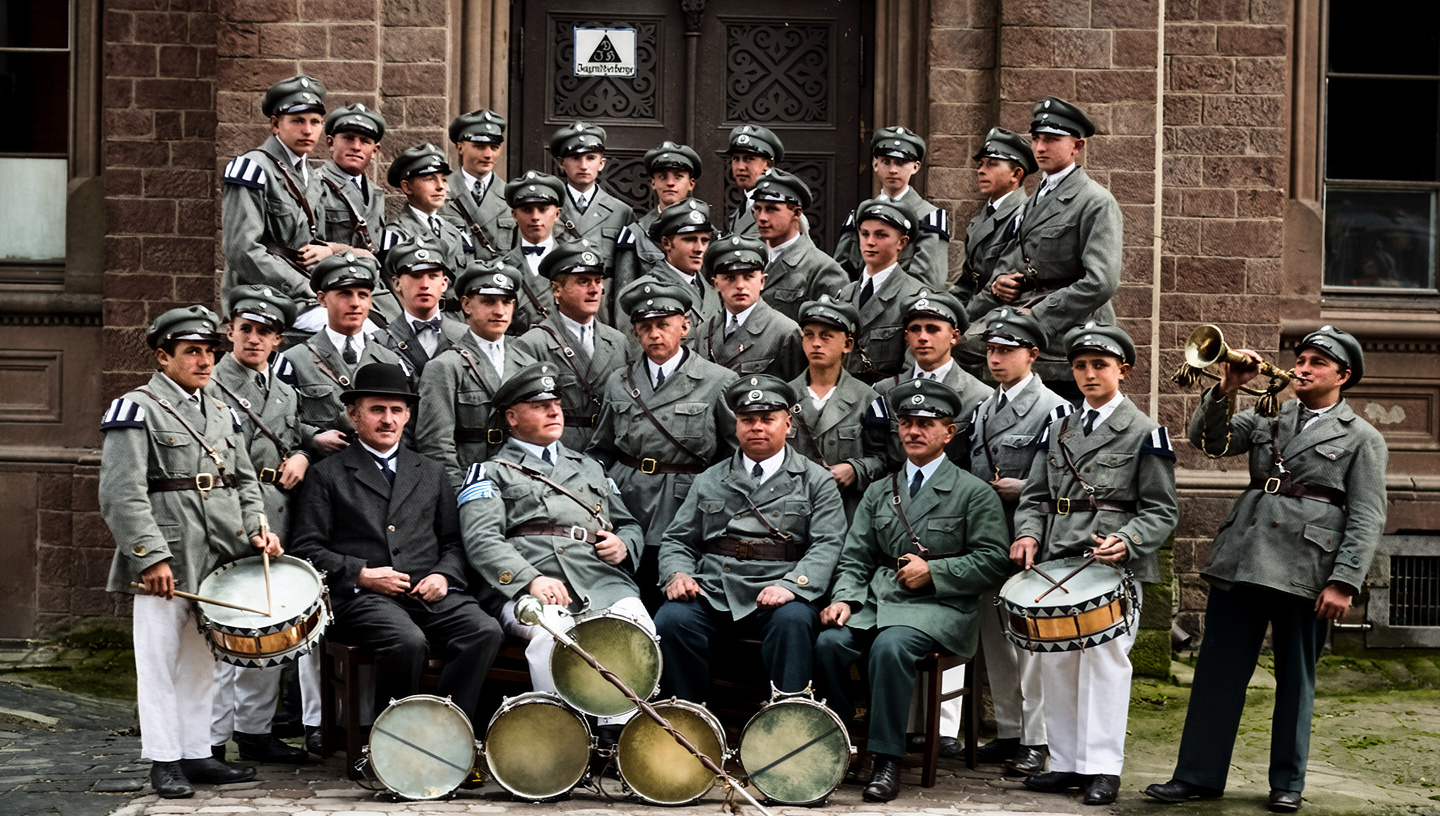 Kriegerverein in Uniform vor der Schule in der Bahnhofstraße - mit dem "Kyffhäuser Spielmannszug", der von 1929 bis 1934 bestand.