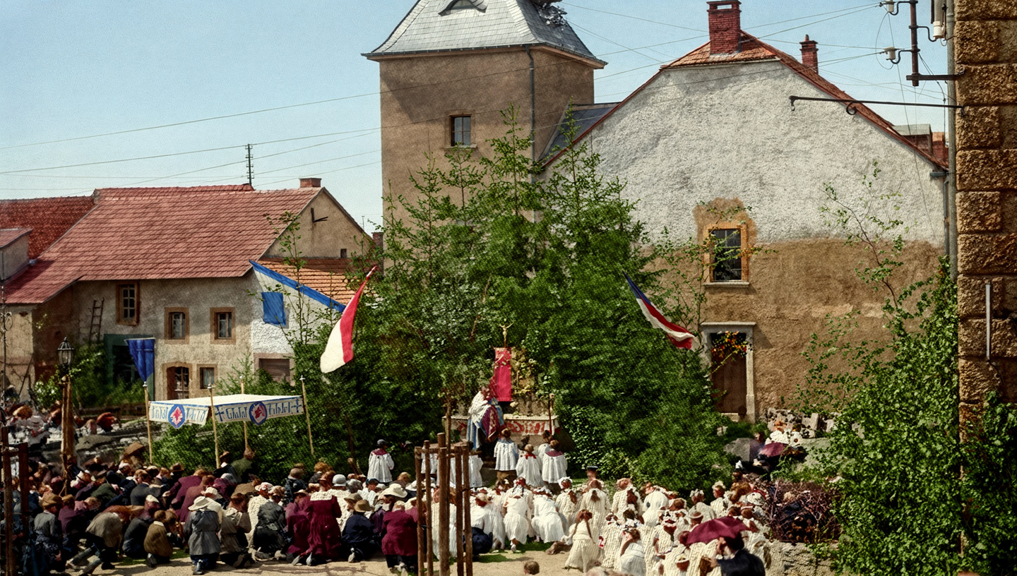 Fronleichnam 1923/26 Altar auf dem Marktplatz Im Hintergrund v.l.: Schlachthaus und Wurstküche der Metzgerei Schneider, Transformatorenhaus, Haus Baumann-Heckenbach