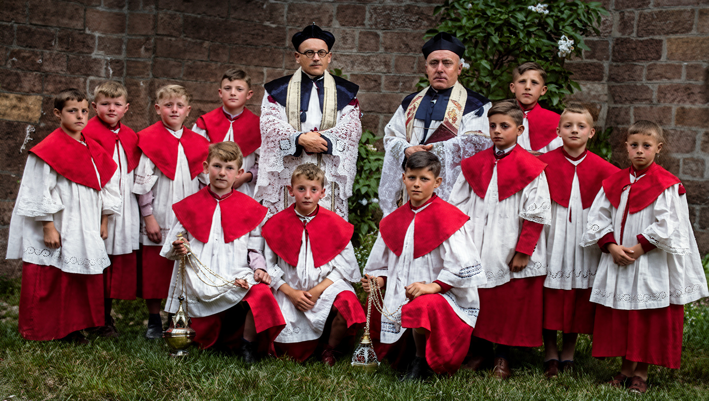 Pfarrer Lauer mit Kaplan und Messdienern, etwa 1934/35