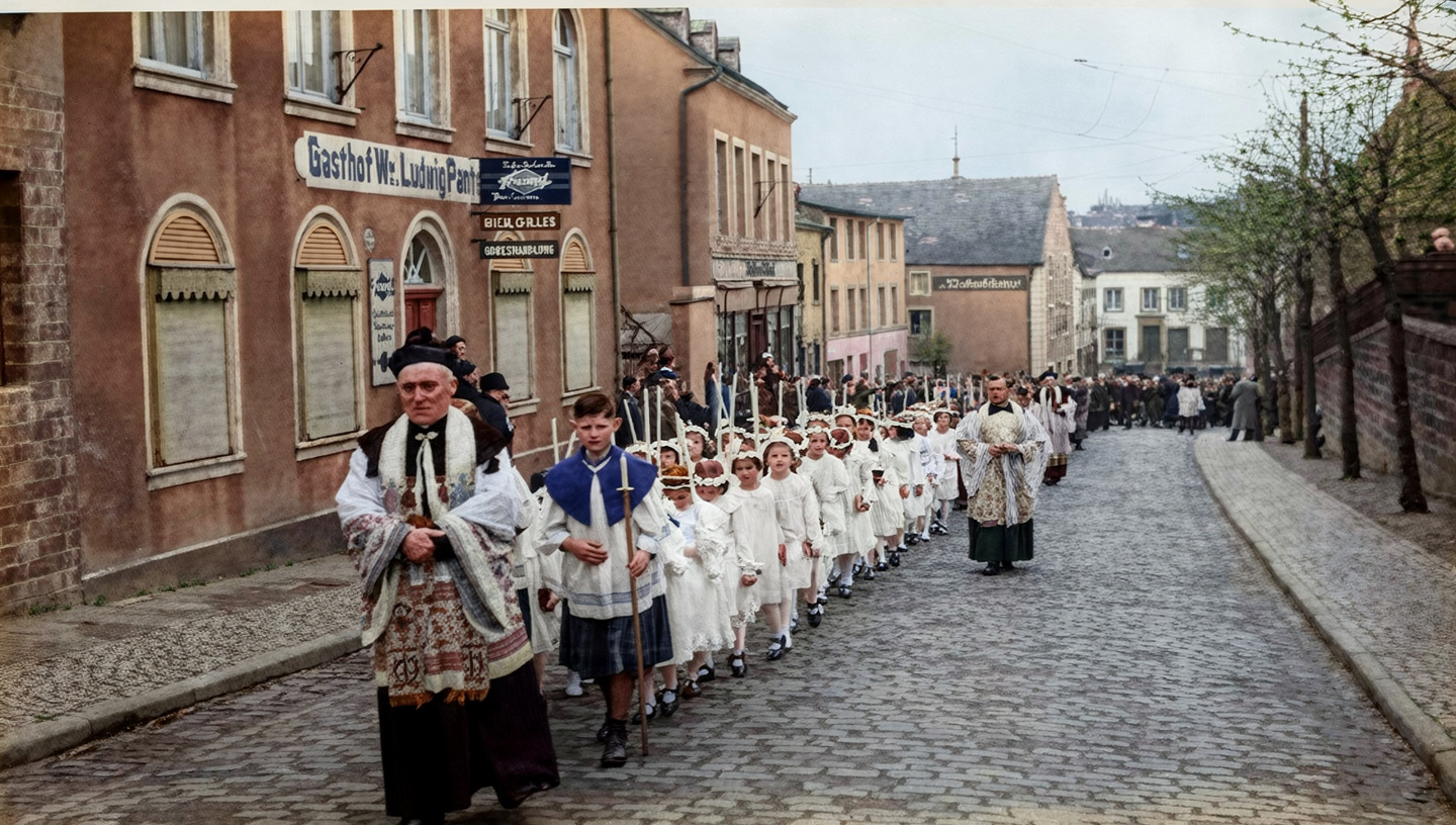 1936/37 - Prozession mit Pfarrer Lauer in der heutigen Kirchstraße bei den Häusern Gasthof Pantenburg (heute: Optiker, Brillenstube), Matthias Kievel (heute: Wilhelm Ersfeld)