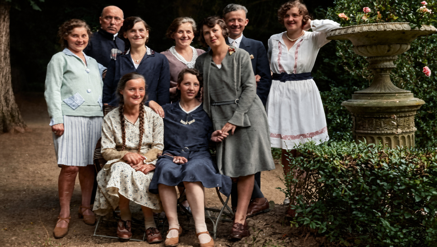 August 1930 - diese Aufnahme entstand bei einem Ausflug an die Mosel Stehend v.l.: Katharina Niederprüm, Dechant Lauer, Margarethe Comes, Katharina Weber, Anna Plein, Peter Müller, Marga Kläs Sitzend: Annchen Faber, Angela Plein