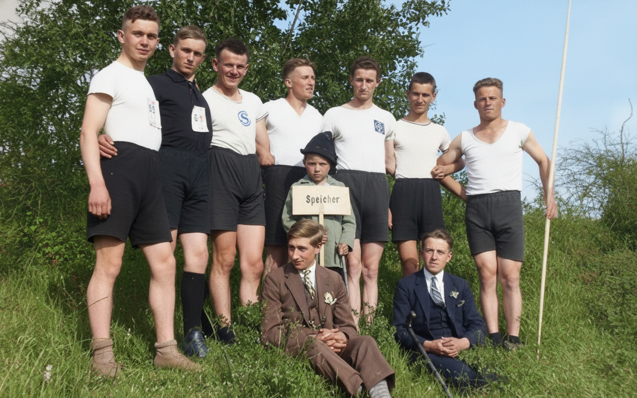 7.11.1929 Beim "Staffel-Jugendtag in Bitburg" Stehend v. l.: Johann Follmann, Adam Mühlen, Thomas Pütz, Karl Hött, H. Kneppel, Jakob Schneider, J. P. Franzen, davor sitzend: Peter Willems, Johann Boden