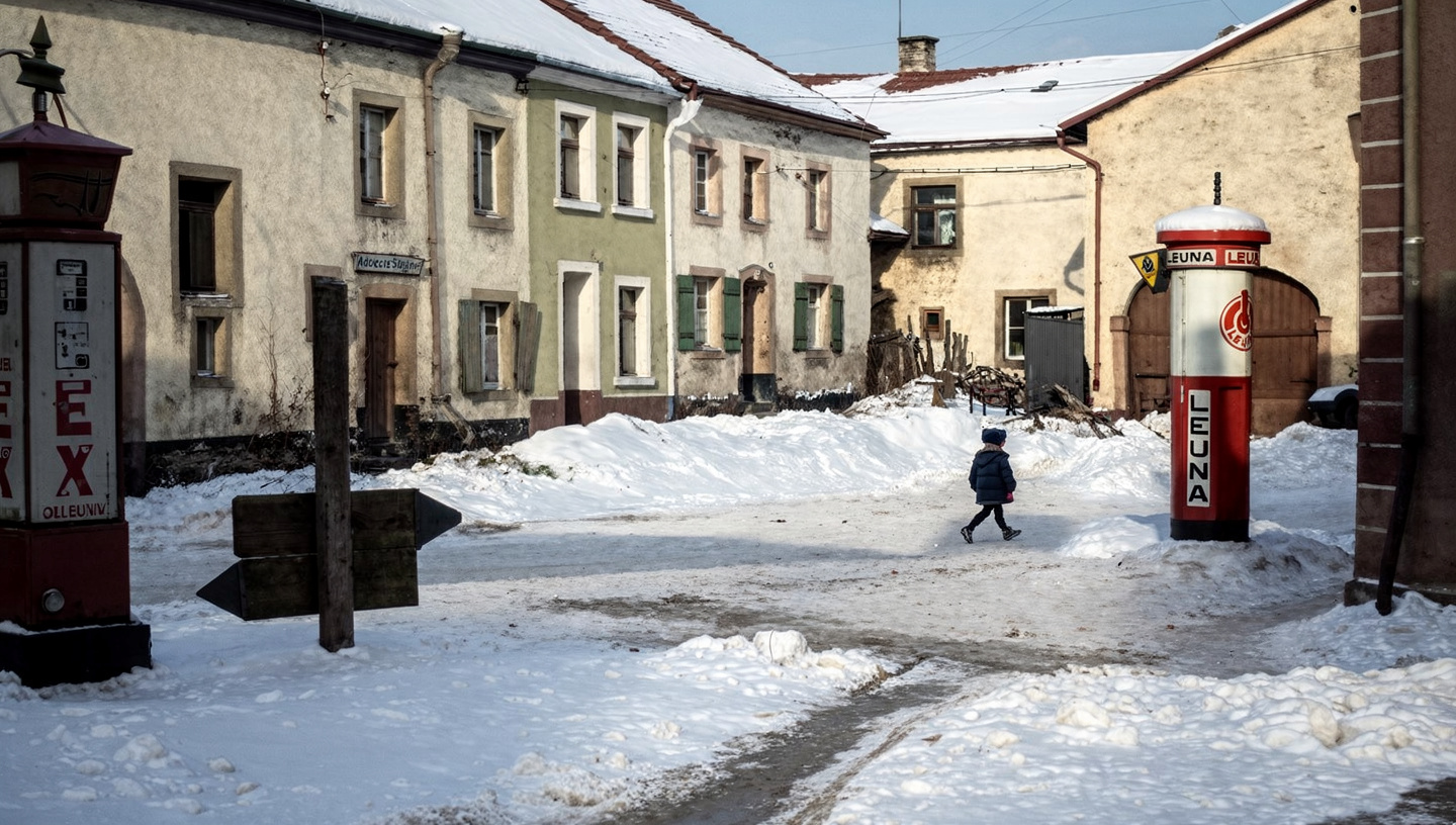 1940 Winterlandschaft in der Kapellenstraße vom Geörgenecken aus gesehen mit Olex- und Leunazapfsäule