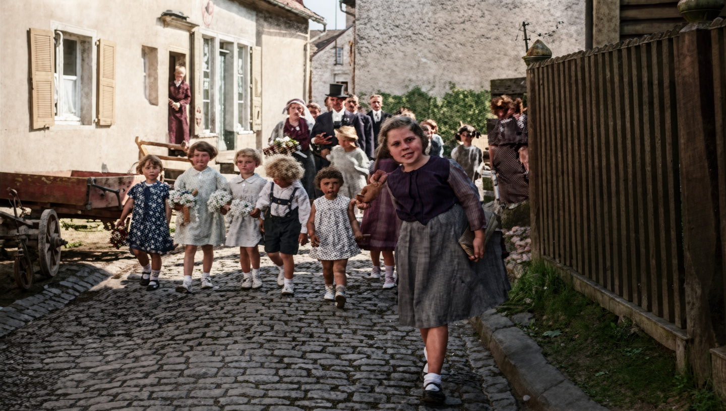 1938 Hochzeitspaar im Grünecken Links: Eisenwaren Wilhelm Weber Mitte: schöner Treppeniebel des Stalles Mayer Rechts: Holzlagerschuppen der Schreinerei Heinz (Zämer Fränz)