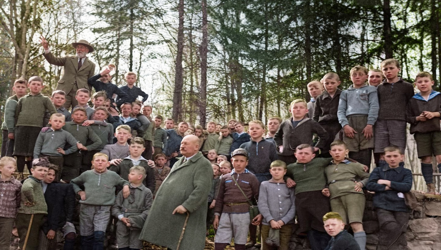 Wanderung der Jahrgänge 1918-1921 zu den römischen Töpfereien auf der "Heerst". 1932 mit Rektor Nikolaus Baumann.