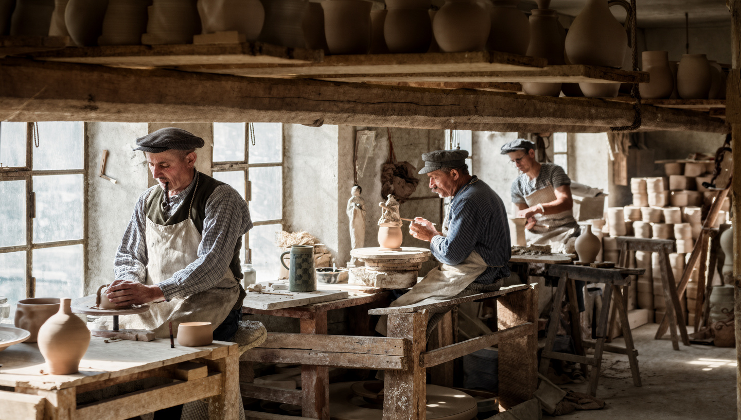 1923 Töpfer bei der Arbeit in der Töpferstube Plein-Wagner. Matthias Becker, Johann Becker, Peter Schwickerath